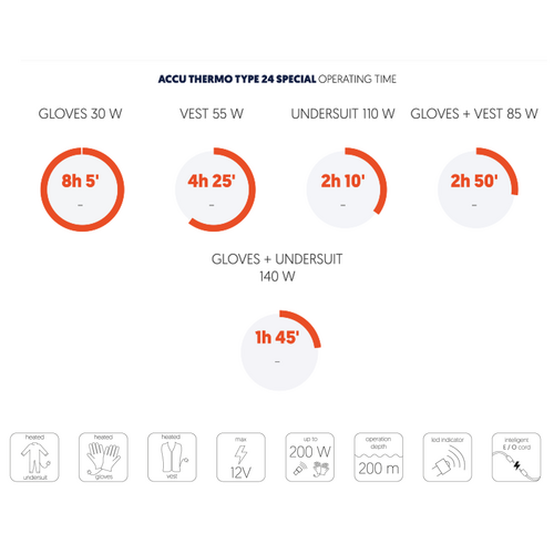 Baterija ACCU THERMO je bila zasnovana za učinkovito in zanesljivo napajanje ogrevanih potapljaških oblačil in popkovnih potapljaških luči, ki delujejo pri 12 V.